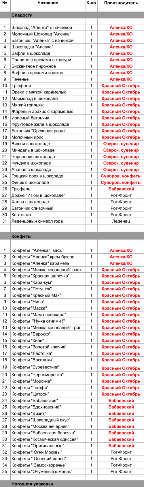 Трюфели (1 шт),Орехи с мягкой карамелью (1 шт),Мармелад в шоколаде (1 шт),Мягкий грильяж (1 шт),Жареный арахис с карамелью (1 шт),Ирисный батончик (1 шт),Фруктовое желе в шоколаде (1 шт),Батончик "Ореховая роща" (1 шт),Молочный ирис (1 шт),Конфеты "Мишка косолапый" ваф. (1 шт),Конфеты "Красная шапочка" (1 шт),Конфеты "Кара-кум" (1 шт),Конфеты "Петушок" (1 шт),Конфеты "Красный Мак" (1 шт),Конфеты "Нива" (1 шт),Конфеты "Маска" (1 шт),Конфеты "Мама приехала" (1 шт),Конфеты "Ну-ка отними !" (1 шт),Конфеты "Мишка косолапый" грил. (1 шт),Конфеты "Барокко" (1 шт),Конфеты "Киви" (1 шт),Конфеты "Золотой ключик" (1 шт),Конфеты "Ласточка" (1 шт),Конфеты "Васильки" (1 шт),Конфеты "Буревестник" (1 шт),Конфеты "Черноморочка" (1 шт),Конфеты "Морские" (1 шт),Конфеты "Toффи" (1 шт),Конфеты "Цитрон" (1 шт)